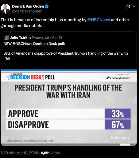 Van Orden spent a better part of his week attacking the “mainstream media” for their coverage of the Trump administration’s illegal war with Iran. He is apparently convinced that bad press, and not an actual war, is what is driving unpopularity.